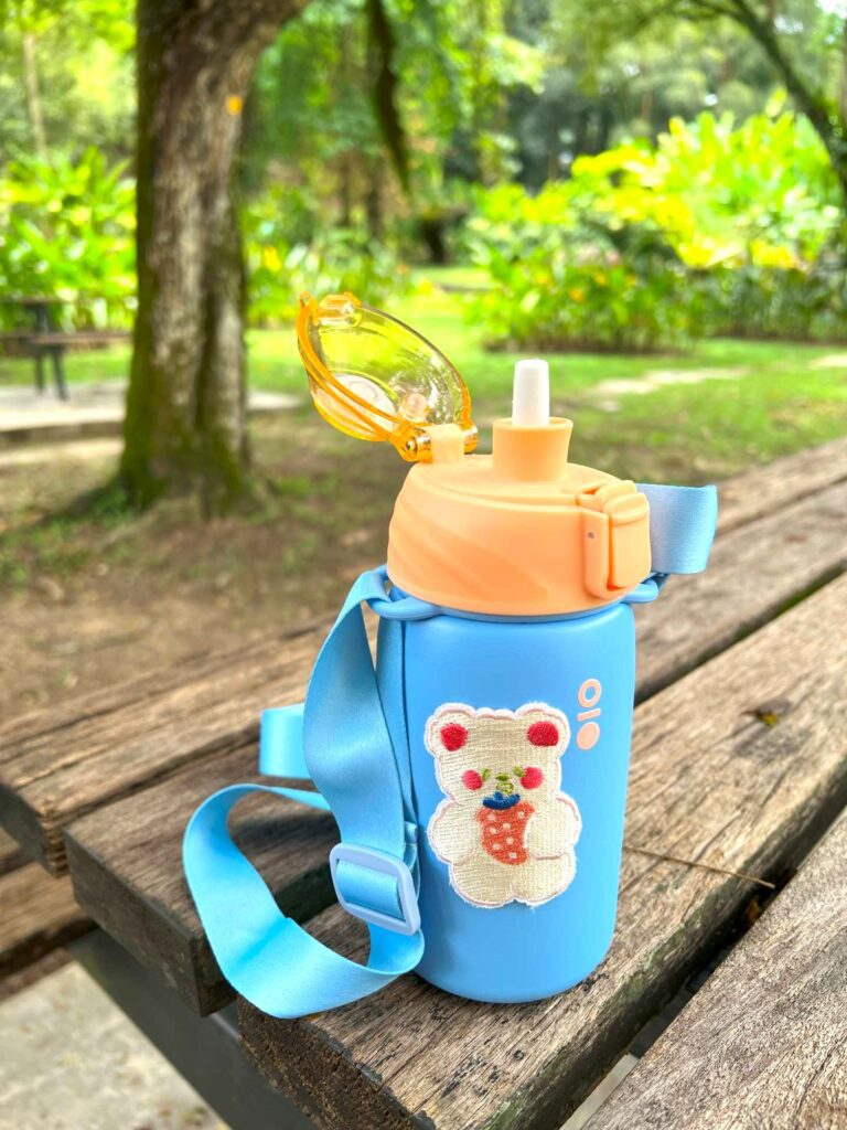 In true OiYO fashion, it’s super functional too. The 400ml bottle comes with a push-button cap (which makes the bouncy straw pop up!) and a soft sling strap.