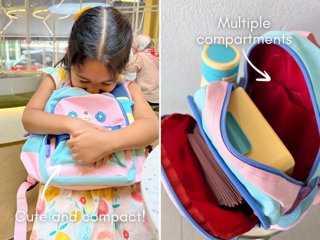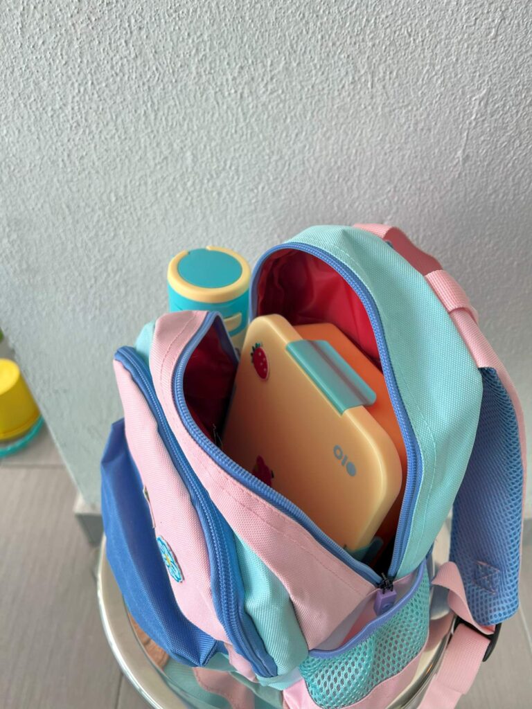 - 3 compartments – fits the lunch box, water bottle, care essentials, and room to spare for random stuff kids can’t leave home without (mine won’t go out without a corn stuffie we got at a random event 😅)